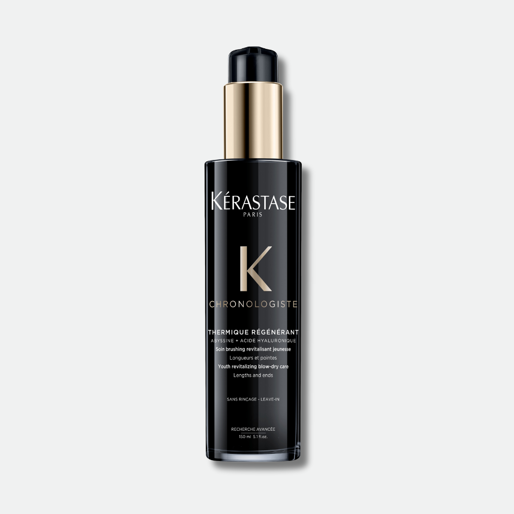 Chronologiste Thermique Régénérant de KÉRASTASE est un soin coiffant enrichi d’acide hyaluronique, d’abyssine et de vitamine E. Il améliore la texture du cheveu, scelle les cuticules, lisse la chevelure et dompte les frisottis pendant 96 heures. De plus, il offre une protection contre la chaleur jusqu’à 230 °C.