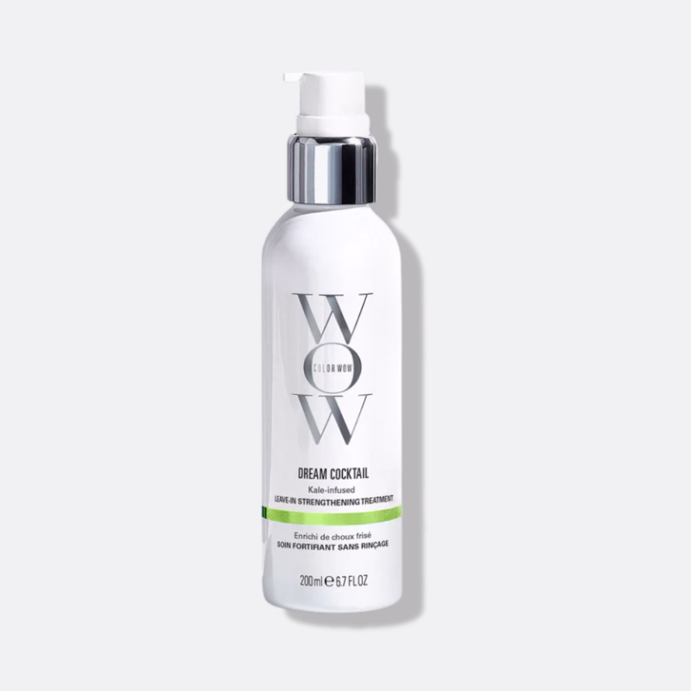 Dream Cocktail Kale-Infused Leave-In Strengthening Treatment de COLOR WOW. Révélez des cheveux renforcés et protégés dès le premier brushing avec ce soin léger enrichi en kale. Conçu pour réduire la casse jusqu’à 50%* en une seule application, il enveloppe chaque fibre d’un complexe renforçant et thermoprotecteur. Idéal pour les cheveux fragilisés, abîmés, colorés ou chimiquement traités, ce traitement redonne résistance, élasticité et une apparence saine immédiatement.